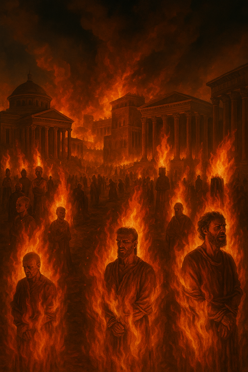 Împăratul Nero, cunoscut pentru cruzimea și instabilitatea sa, este considerat de mulți ca fiind responsabil pentru acest dezastru. Se spune că, în timp ce orașul ardea, Nero „cânta la liră”, inspirat de flăcări și suferință. În delirul său, și-ar fi luminat grădinile imperiale cu torțe vii – creștini persecutați, înveliți în materiale îmbibate în ulei și aprinși de vii.